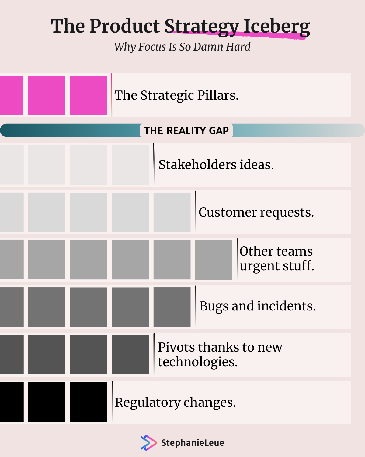 Above the water, you see the “Strategy”—the big goals and the vision. But below the water is the massive bulk of daily deluges: bugs, small feature requests, “special” deals for Sales, and sudden pivots. If you keep saying “yes” to everything below the water, the Iceberg sinks. Your strategy is submerged by indiscriminate “yeses.” True mastery is keeping the strategy above water by hacking away at the ice below.