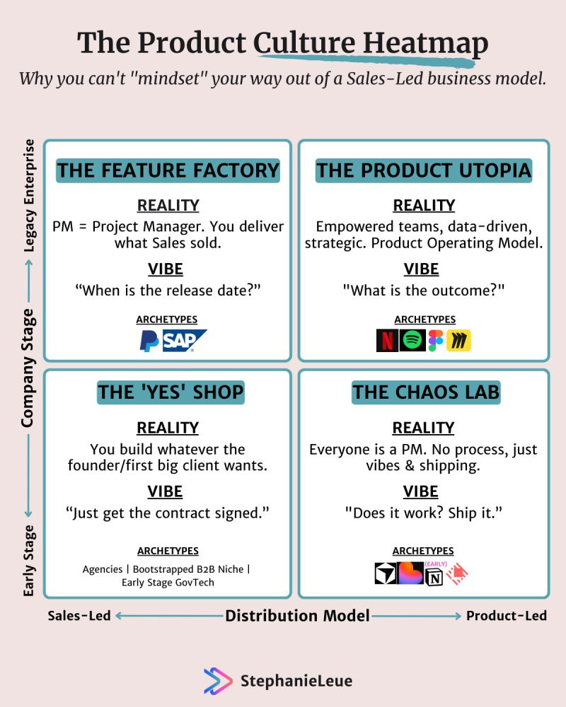 I’ve created a Product Culture Heatmap to reveal where product models clash with revenue realities. Most burnout happens when you try to act like you’re in Zone 4 (Product Utopia), but your company actually lives in Zone 1 (Feature Factory).
