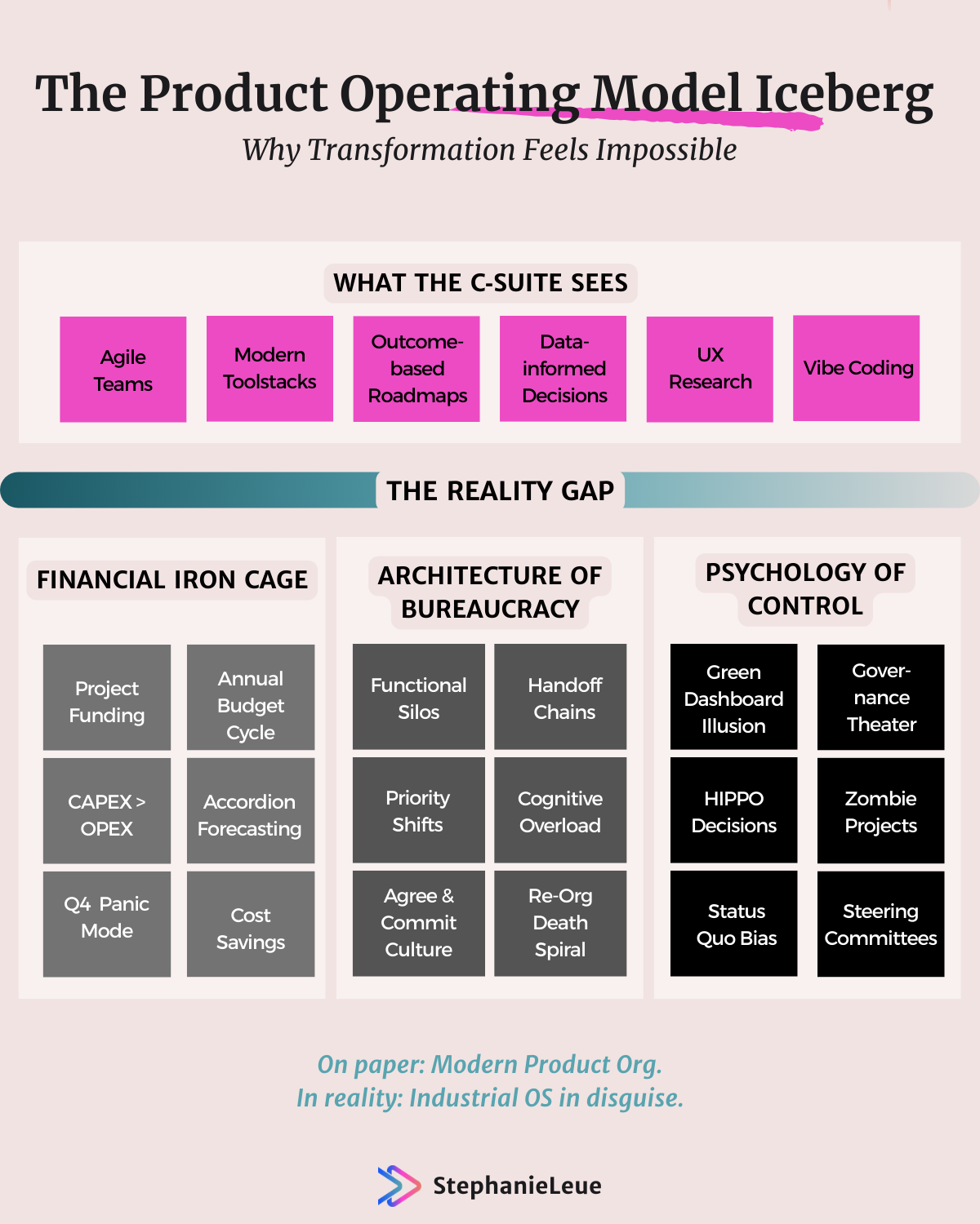 Once a major initiative has an executive sponsor, sunk cost and reputation make it difficult to stop, even when evidence says it should. Highest‑paid opinions still dominate when data is ambiguous, and status‑quo bias pulls people back to familiar ways of working whenever pressure increases. The result is a system that speaks the language of empowered, outcome‑driven product teams, but behaves like a carefully controlled project machine. If that feels familiar, it is a sign that the visible practices have changed—but the operating system underneath has not.